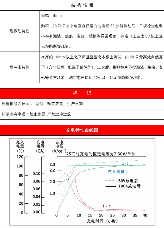 6、耐充电性好:25摄氏度,完全充电状态的电池0.1CA充电48小时,无漏 液,无电池膨胀及破裂,开路电压正常,容量维持率在95%以上。